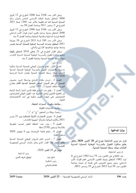 للقبول بالمدرسة الوطنية للحماية المدنية لانتداب عرفاء بسلك الحماية المدنية بعنوان السنة الدراسية 2020-2021.