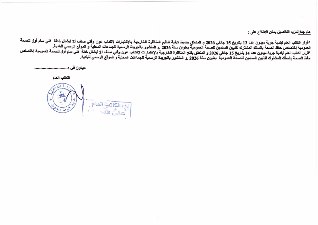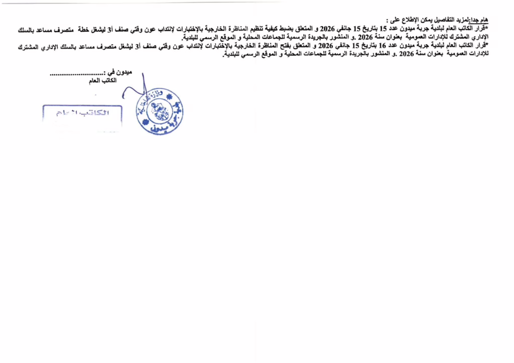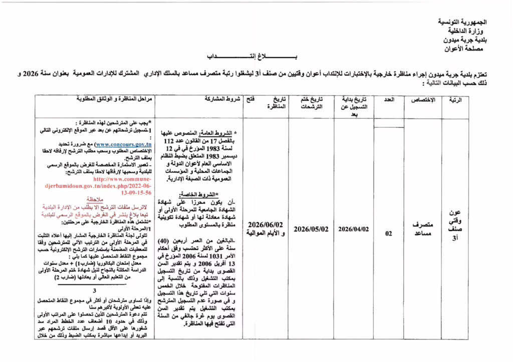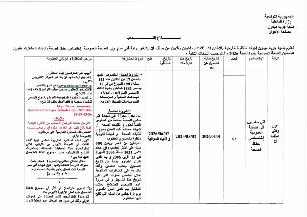 جديد مناظرات البلديات لإنتداب أعوان إداريين و عملة الهيكل الخطة عدد الخطط غلق الترشح غلق المناظرة التفاصيل النتيجة الأولية النتيجة النهائية بلدية ساقية الدائر سائق في الوزن الثقيل 3 2026-05-22 2026-05-22 التفاصيل — — بلدية ساقية الدائر رافع فضلات 10 2026-05-22 2026-05-22 التفاصيل — — بلدية رقادة رافع فضلات 4 2026-05-21 2026-05-21 التفاصيل — — بلدية رقادة كهربائي بناء 1 2026-05-21 2026-05-21 التفاصيل — — بلدية رقادة ميكانيكي سيارات بنزين و ديازل 1 2026-05-21 2026-05-21 التفاصيل — — الهيكل الخطة عدد الخطط غلق الترشح غلق المناظرة التفاصيل النتيجة الأولية النتيجة النهائية بلدية دخيلة توجان رافع فضلات 4 2026-05-20 2026-05-20 التفاصيل — — بلدية العامرة مناظرة بالاختبارات لإعادة توظيف أعوان الدولة و الجماعات المحلية و المؤسسات العمومية ذات الصبغة الإدارية إلى رتبة كاتب تصرف 4 2026-05-20 2026-05-20 التفاصيل — — بلدية خنيس رافع فضلات 3 2026-05-15 2026-05-15 التفاصيل — — بلدية خنيس عامل بالوحدة الثانية (سائق في الوزن الثقيل ) 1 2026-05-15 2026-05-15 التفاصيل — — بلدية خنيس منظف 1 2026-05-15 2026-05-15 التفاصيل — — بلدية سيدي بنور عامل نظافة 1 2026-05-08 2026-05-08 التفاصيل لم تنشر لم تنشر الهيكل الخطة عدد الخطط غلق الترشح غلق المناظرة التفاصيل النتيجة الأولية النتيجة النهائية بلدية سيدي بنور سائق وزن ثقيل 1 2026-05-08 2026-05-08 التفاصيل لم تنشر لم تنشر المركز الوطني لرسم الخرائط والاستشعار عن بعد عامل (ة) تنظيف 4 2026-05-06 2026-05-06 التفاصيل — — المركز الوطني لرسم الخرائط والاستشعار عن بعد عامل مناطق خضراء (بستنة) 2 2026-05-06 2026-05-06 التفاصيل — — بلدية بئر علي بن خليفة عامل صنف 03 6 2026-04-30 2026-04-30 التفاصيل — — بلدية جربة ميدون هندسة مدنية 2 2026-05-02 2026-05-02 التفاصيل — — Postuler / قدم لهذا العرض كل مناظرات البلديات المفتوحة حاليا في مختلف مناطق الجمهورية Navigation de l’article مناظرة وزارة العدل لانتداب 523 مترجما محلفا حسب الإختصاص : آخر أجل 18 جانفي 2024المعهد الوطني للإحصاء يفتح مناظرة خارجية للانتداب : آخر أجل للتسجيل 02 فيفري 2024